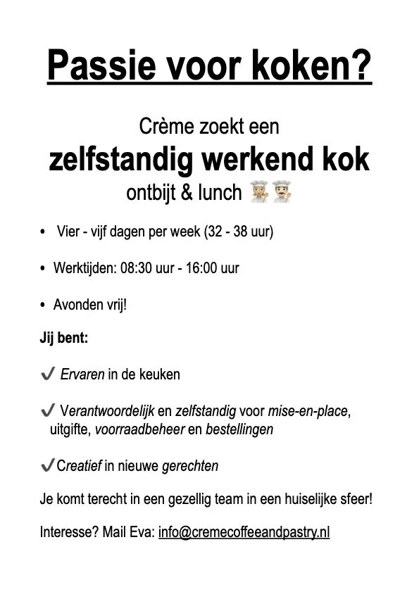 Interesse? Mail je motivatie & CV naar Eva: info@cremecoffeeandpastry.nl